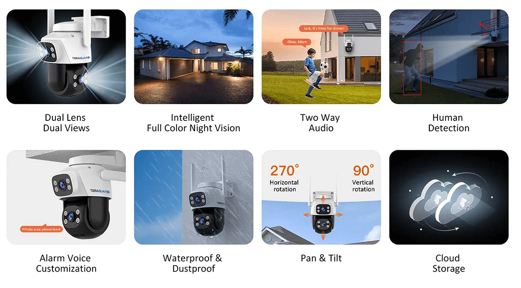 המצלמה מצוידת בתאורה כפולה (לבן + אינפרא אדום) לראיית לילה צבעונית לטווח של 5 עד 30 מטרים, ומזהה בני אדם בזמן אמת עם התראות חכמות לנייד.